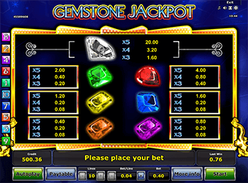 Не думайте, что онлайн-автомат Gemstone Jackpot – это классическая малофункциональная разработка фирмы Novomatic. На самом деле эта игра даст фору многим современным гаминаторам. В ней есть функция блокировки выигрышных символов. Как только вы встретите комбинацию на барабанах, знаки накроет клетка, а оставшиеся элементы сменятся на другие. Если снова появятся призовые символы, Lock & Spin повторится снова абсолютно бесплатно.