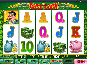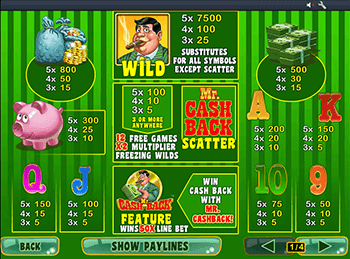 На описываемом симуляторе размещаются тематические картинки. Во время игры вы увидите свинью-копилку, мешки наличных денег, пачки долларов, мужчину и буквенные номиналы игральных карт от девятки до туза. Кстати, последние – наименее ценные пиктограммы. Не забыл производитель игры и о специальных символах. Вайлдом слота стал сам мистер Кэшбэк. Он создаст выигрышную комбинацию, заменив все картинки кроме Скаттера, которым выступает логотип аппарата. Последний предоставит право на 12 фриспинов. При этом выигрыш будет умножаться на два, а во время вращений на экране будут появляться Дикие символы.